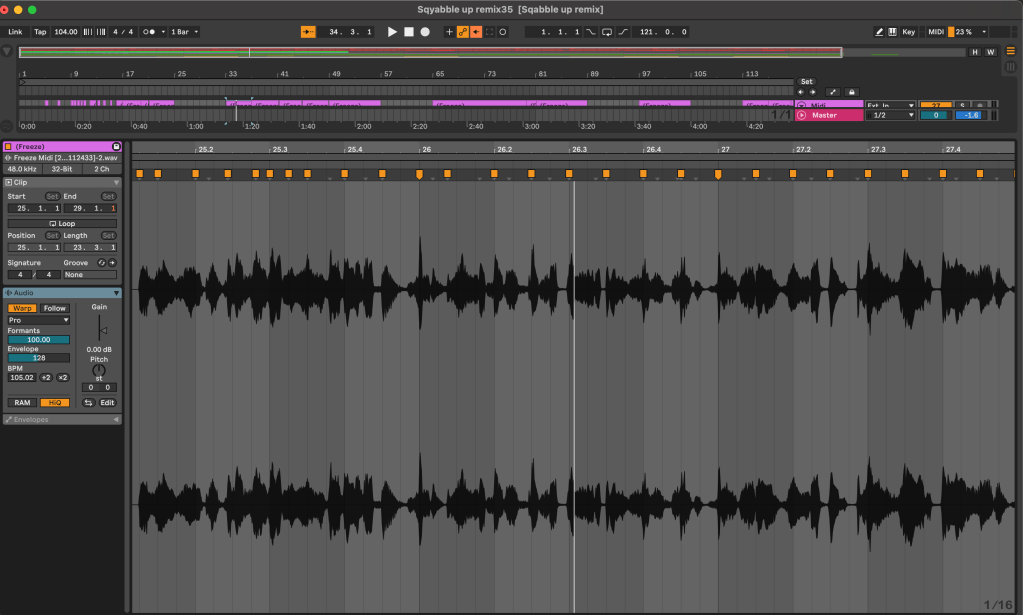 When I imported the vocal stem I realised that the rhythm Kendrick raps doesn’t suit the rhythm I had with the breaks and timing was a bit off. I had to use Ableton Live’s warp function to adjust the timing of the phrasing used in his rap vocals.