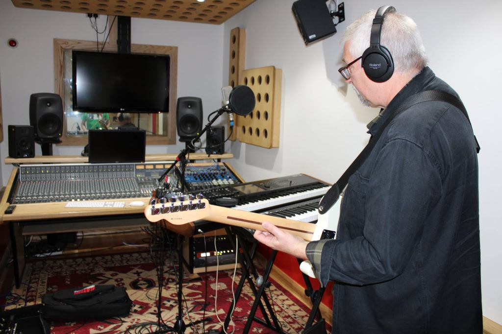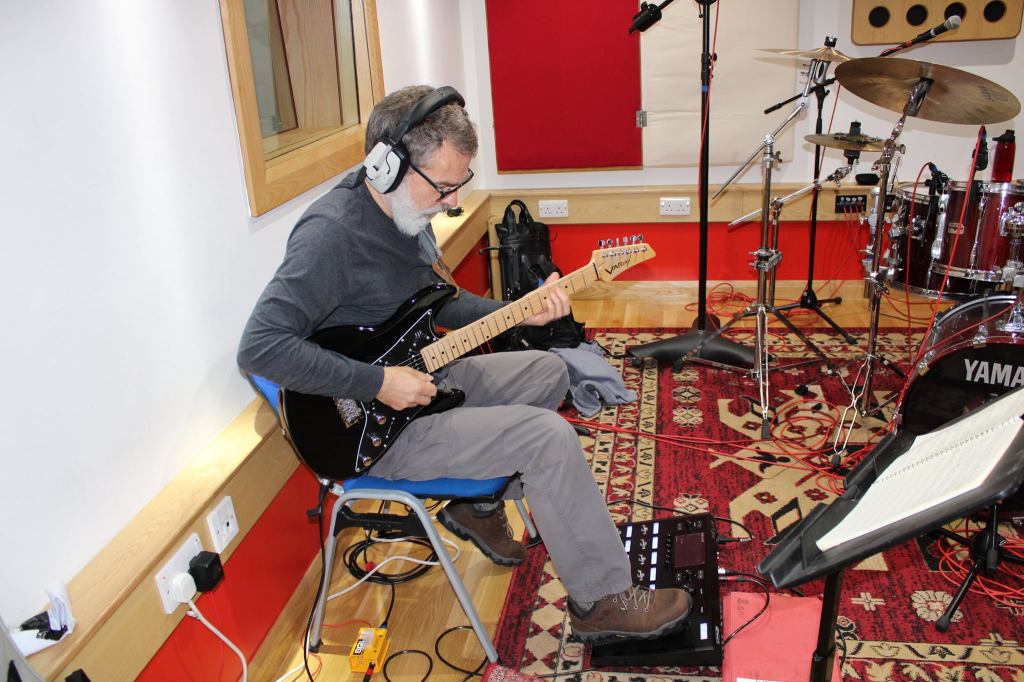 The DI’d signal from the three electric guitars and the bass guitar were re-amped through to the biggest live room and the signals sent to amps mic’d up and spaced out through the room to avoid spill. I also used some baffles to try and help with spill and consideration of mic placement.